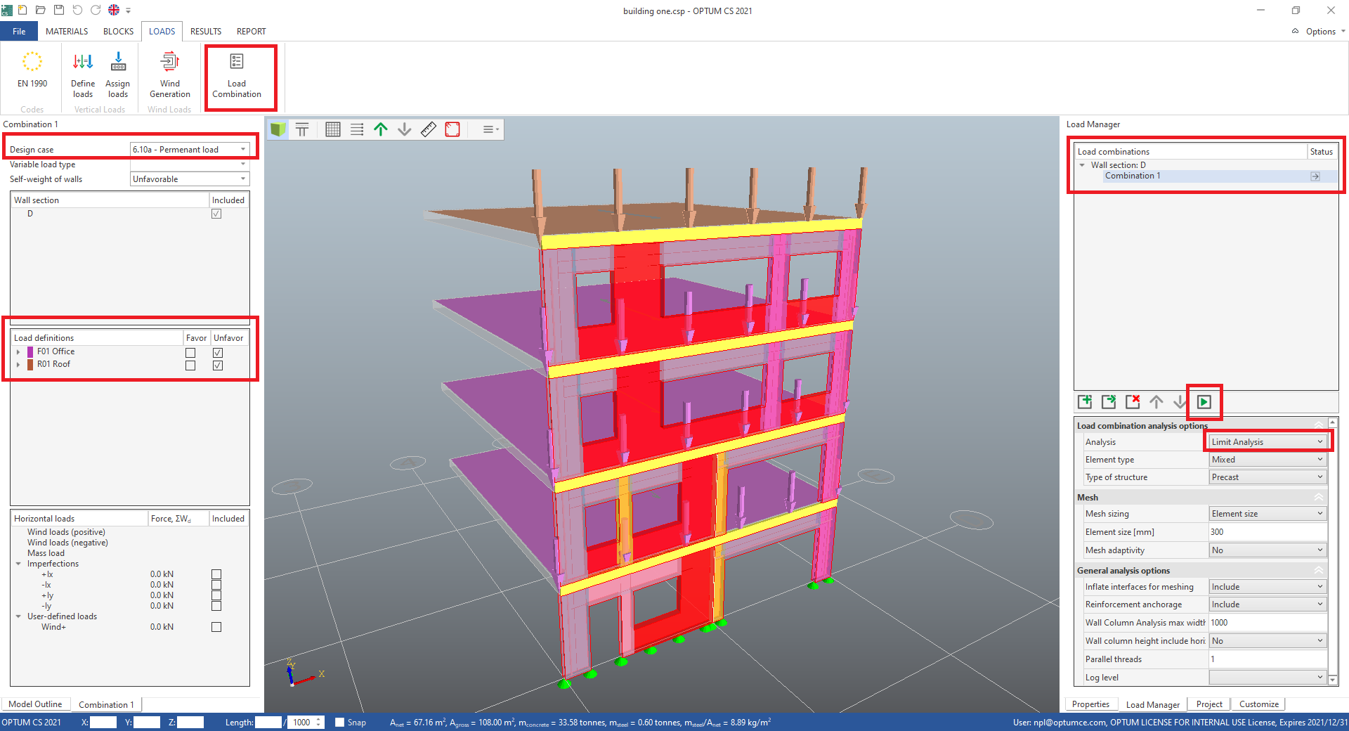 - Check that Load definition F01 Office and R01 Roof are included as unfavorable.