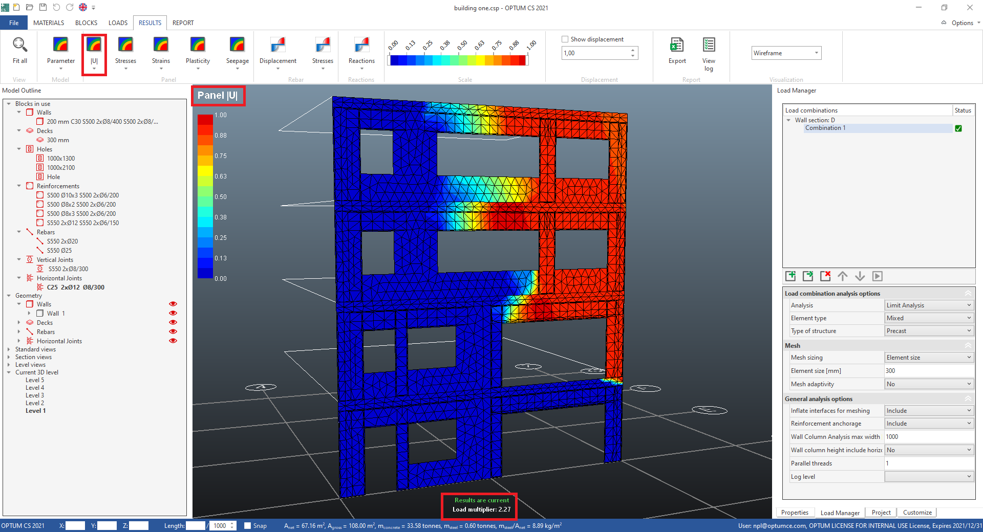 In this example the calculation results in a load multiplier of 2.27. For design case 6.10a, this means that all permanent loads multiplied by a factor of 2.27 will result in structural failure. The displacement plot "Panel |U|" that is shown, illustrates the collapse mechanism for this load.