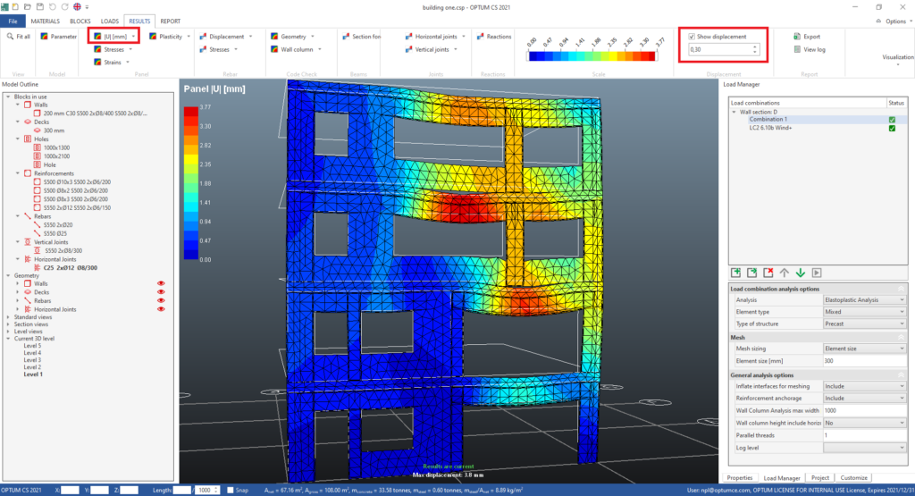- Add a check mark in the Show displacement box in the ribbon, and adjust the scaling using the mouse wheel while the cursor is on the scale input field, to show the wall section in deformed shape.