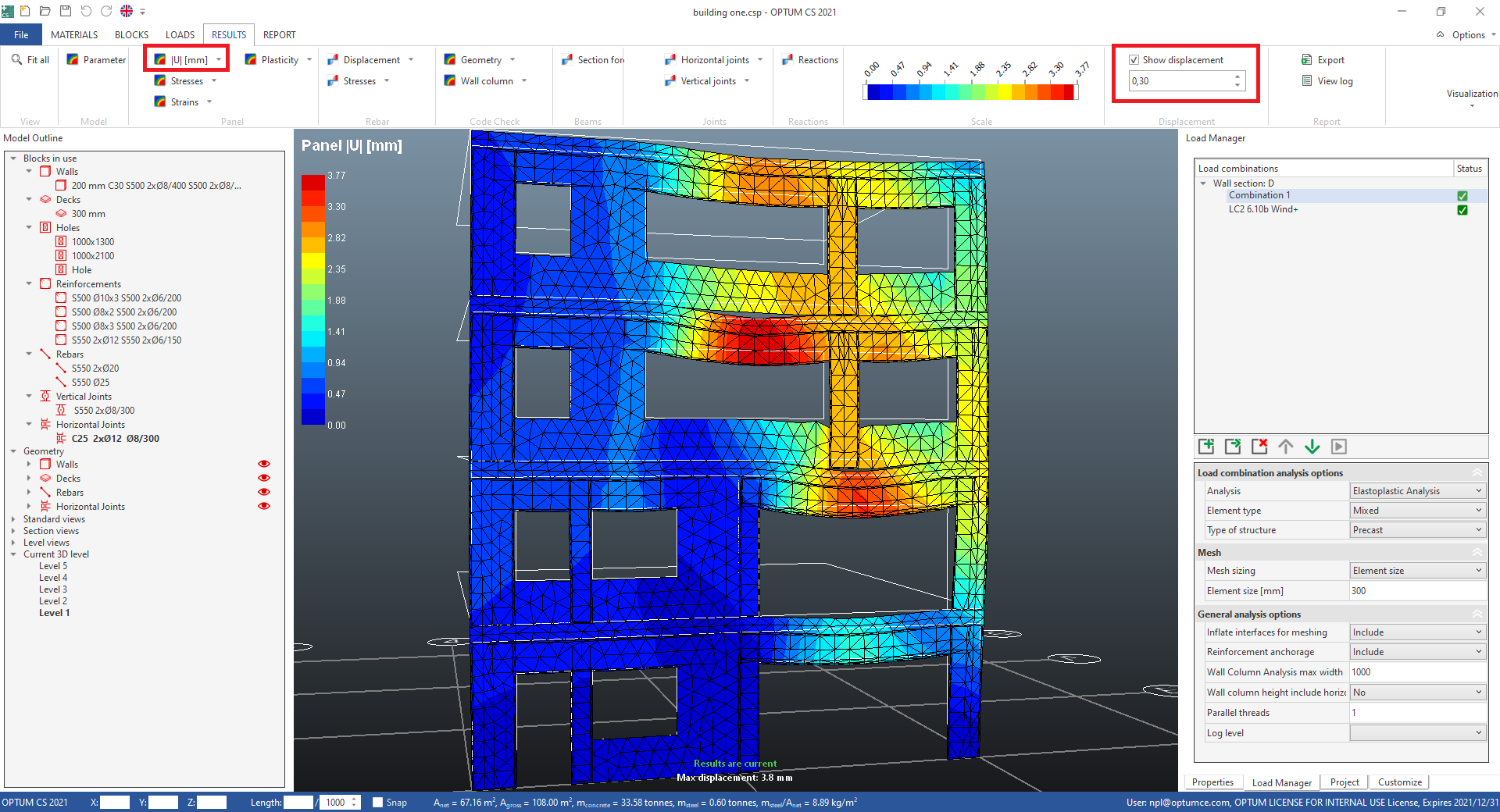 In the RESULTS tab, the displacement plot "Panel |U|" is displayed. This is the actual in-plane displacement. Elastoplastic behaviour of the concrete and reinforcement is taken into account in this calculation, making the result very accurate, compared to a linear elastic calculation.