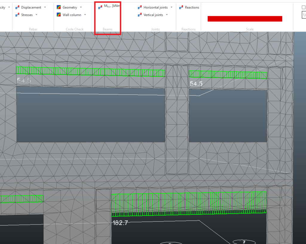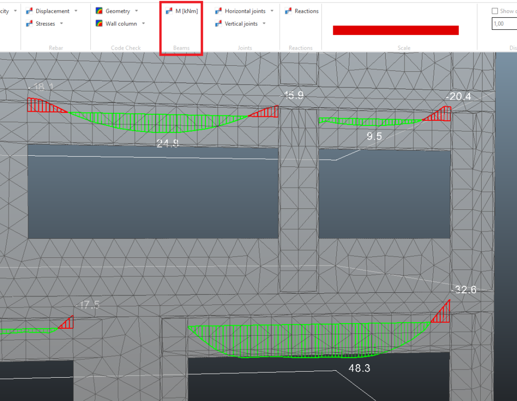 The utilization of the wall slices are visualized for each load combination in the "Code Check M0Ed/M0Rd" plot in the Wall column menu in the Code check section in the ribbon.