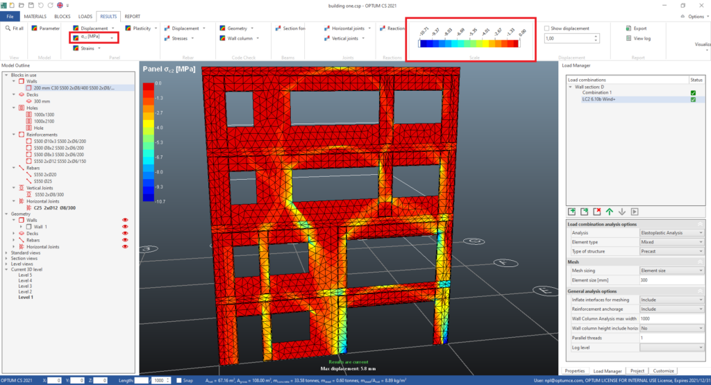 - Select the other load combination in the load manager and check if the displacement corresponds to the direction of the applied horizontal loads.