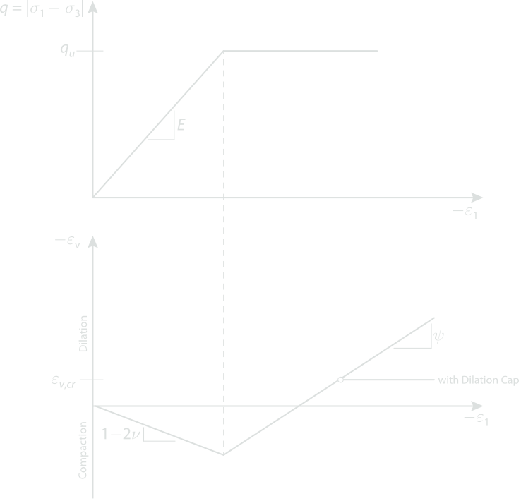 In GX, the basic choice of flow rule is between Associated and Nonassociated. In the former case, \psi=\phi. In the latter case, \psi is specified along with a possible cap on the dilation. That is, it is possible to define a critical strain above which \psi is set to zero. For Dilation Cap = Yes, the critical strain may be specified either in terms of a volumetric strain, \varepsilon_{v,cr}, or a deviatoric strain \varepsilon_{q,cr} (see Notation for exact definition of these strains).